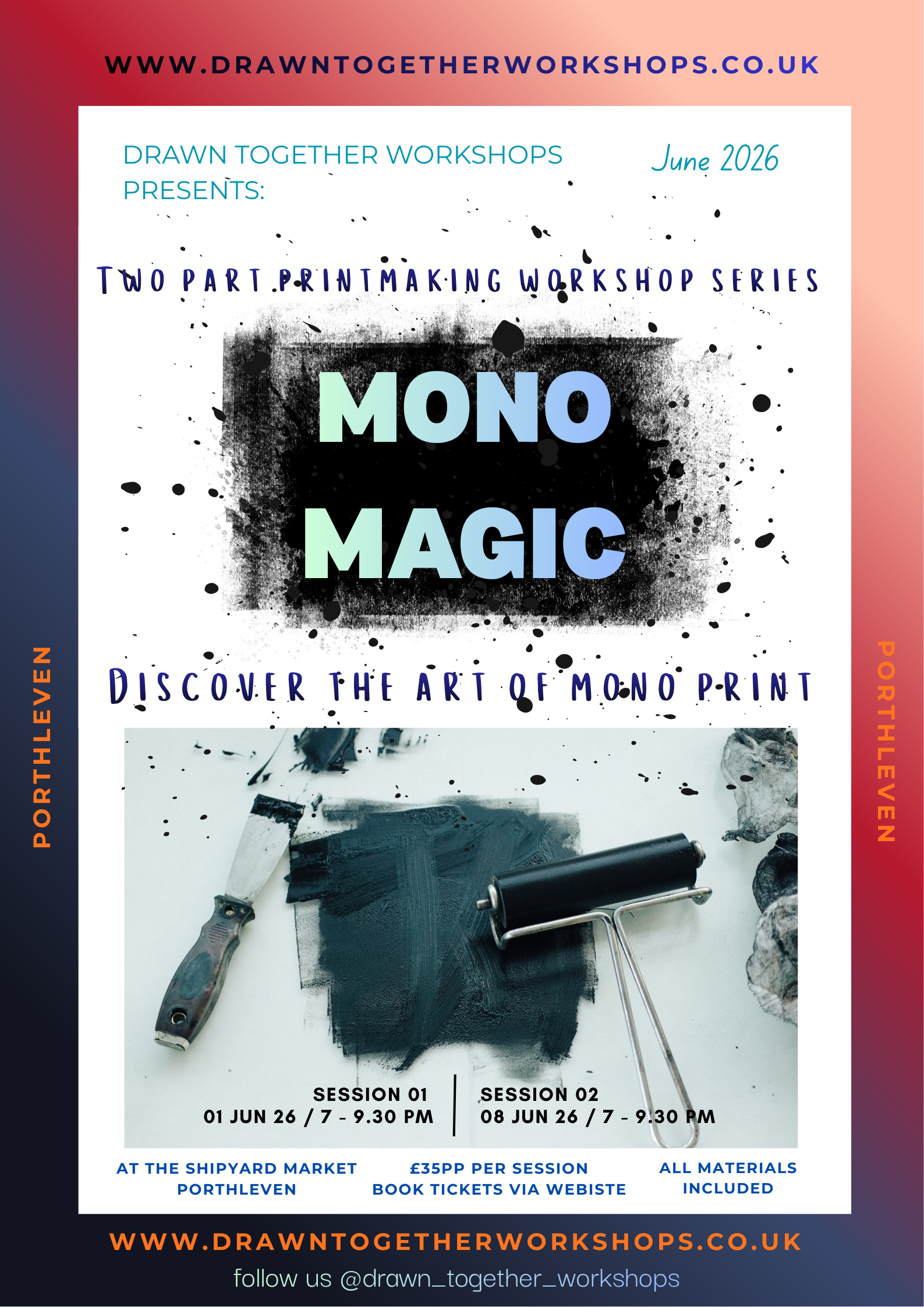 We are very excited to bring to you an introduction into the wonderful world of Monoprint, this 2 part workshop series starting 1st June 2026, is designed to help you learn this amazing print technique as well as finding your own art expression or breath new life into an already established art practice. With a focus on drawing and mark making, we will help you learn the fascinating art of Monoprinting through exploration, creative play and process. We recommend the full 2 part course if you wish to tap into a structure and further develop your art practice, or, you may wish to book a one off workshop in this series that may be of interest specifically . This workshop is a developmental programme, we will work towards a final art piece over the 2 weeks and have many conversations as a group along the way, as well as being supported individually.